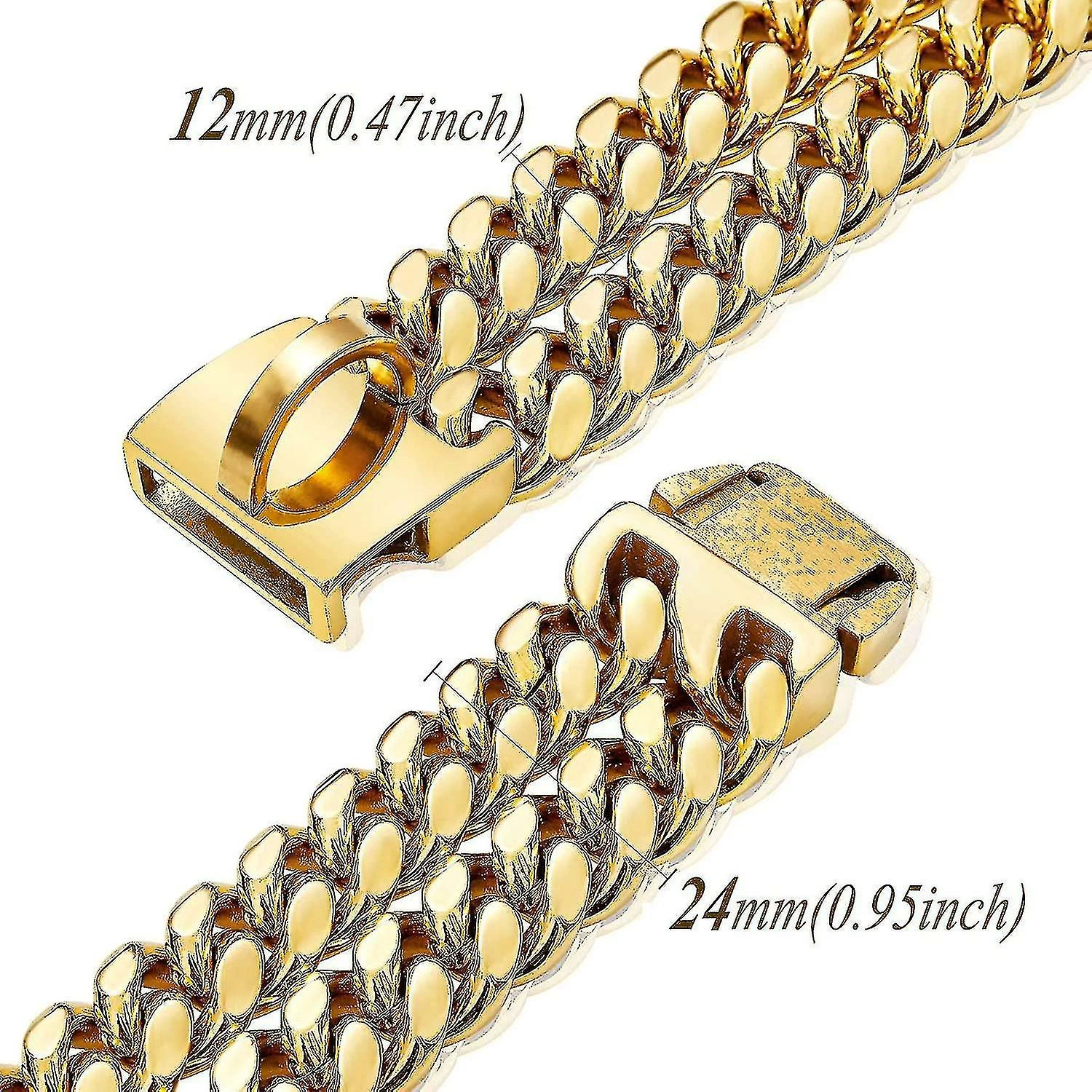 Taille de la chaîne double lourde: large chaîne: 24mm (0.95inch), longueur: 16inch. Le point le plus large autour du cou de votre chien et ajoutez 1 pouce pour la longueur initiale du collier pour le réglage.Boucle en acier inoxydable solide: boucle en acier inoxydable unique avec diamants: Cette boucle est en acier inoxydable 316L, ce qui est très solide. La surface de la boucle est incrustée de nombreux diamants CZ. Lorsque votre bébé chien porte ce collier pour chien avec des diamants, il sera émis lors de la marche au soleil La lumière brillante est très belle. Lorsque vous appuyez sur les deux boutons en même temps, il libérera rapidement votre chien, très rapidement et pratique. Matériau de haute qualité: Fait de collier de chaîne en acier inoxydable 304, poli à la main, plaqué or 18K.Gold Dog Chain Tick Proof, durable, sans rouille, pour des années d’utilisation Il est très fort que ne peut pas le séparer même avec 680 lb de force MODE & STYLISH: Collier de chien en or 18K, belle couleur, c’est bling bling. Des accessoires de cou drôles et étonnants pour vos adorables chiens. Cela vous aidera à obtenir des tonnes de compliments de vos amis, de vos voisins ou d’autres passants. GARANTIE: Si vous avez des problèmes de qualité dans les 90 jours, vous pouvez nous contacter à tout moment pour le service après-vente. Pour une raison quelconque, si vous n’aimez pas absolument notre collier pour chien en or, retournez-le, nous vous rembourserons. (Ou le remplacer, s’il y a un problème).