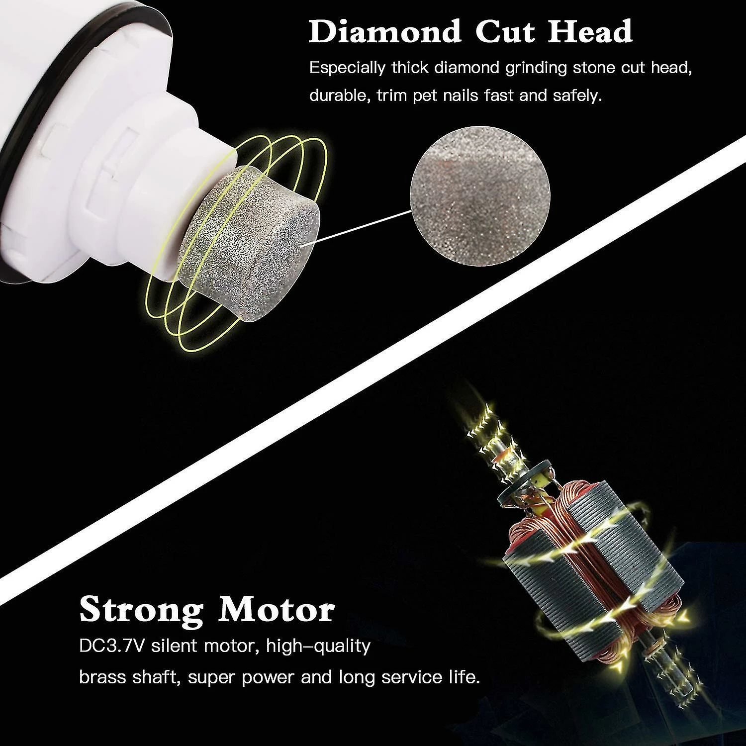 2 ROTARY SPEEDS: Especially adopted thick diamond file stone and powerful motor.With 2 speeds design: 6,000 RPM for trimming accurately, 6800 RPM for quickly filing. You can choose an appropriate speed according to the hardness of pet nails, Ensure safe & quick trimming for your loved pets.