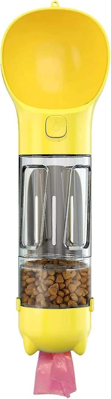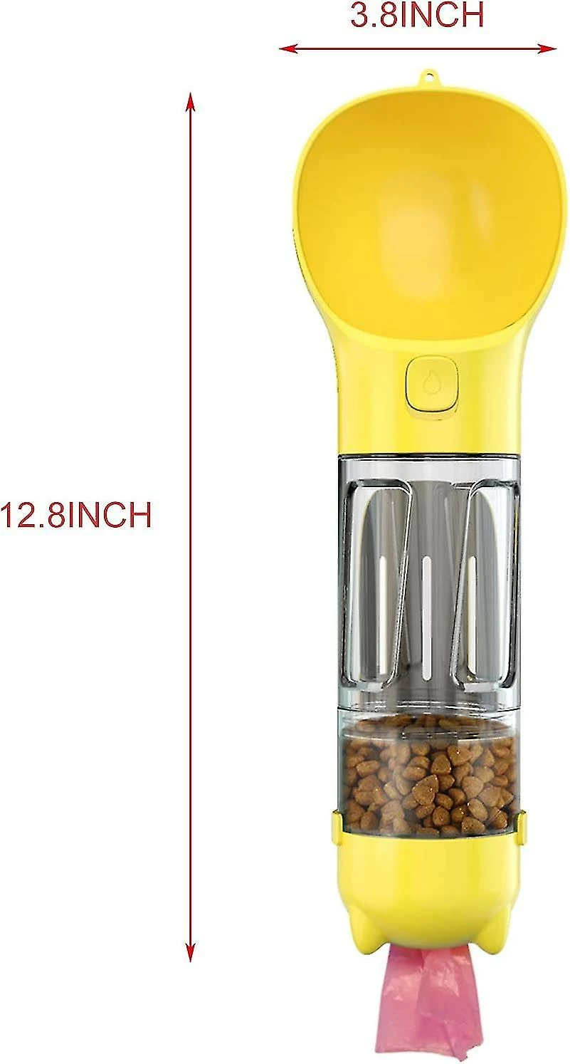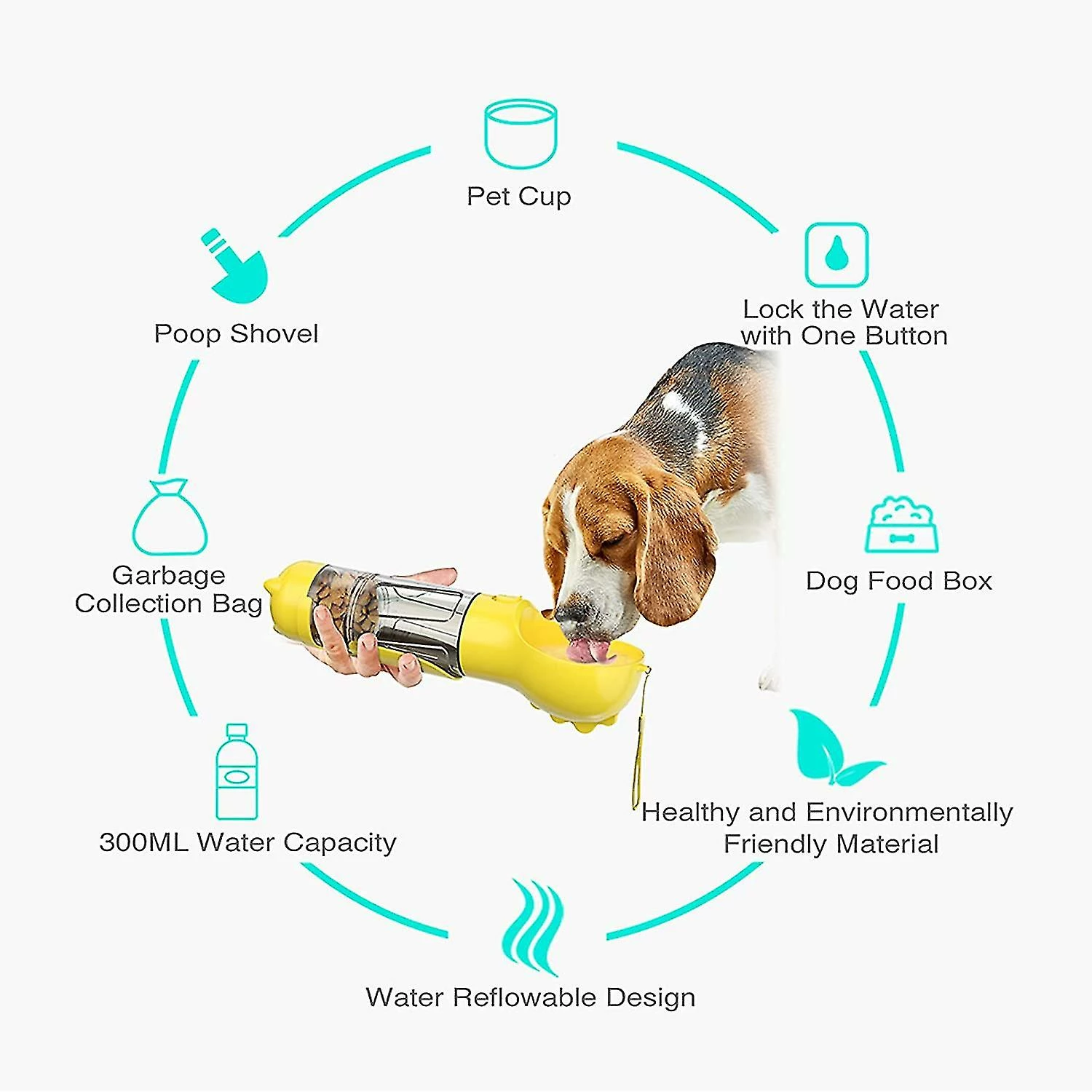Lightweight and multifunctional: easy to carry and use. This pet water bottle has multiple functions, including water supply, poop cleaning and food storage. >Dog Water Bottle with Bowl: The O-shaped design of the feeding bowl gives your dog a comfortable feeling while drinking. Suitable for long term outdoor use, dogs love itDon’t worry about the poop: The bottle comes with a scoop, and the bottle also comes with a disposable trash bag to deal with the poop. It is environmentally friendly and will not cause pollution.EASY TO USE: With one button, you can control pouring and delivery. You put the pet cup in your backpack. It’s a must have for taking your dog on a walk or hike.Food Container: Insert the food container into the portable pet water bottle. When you go out with your dog, if your pet is hungry, you can give him treats or reward him with foodwhen he behaves well