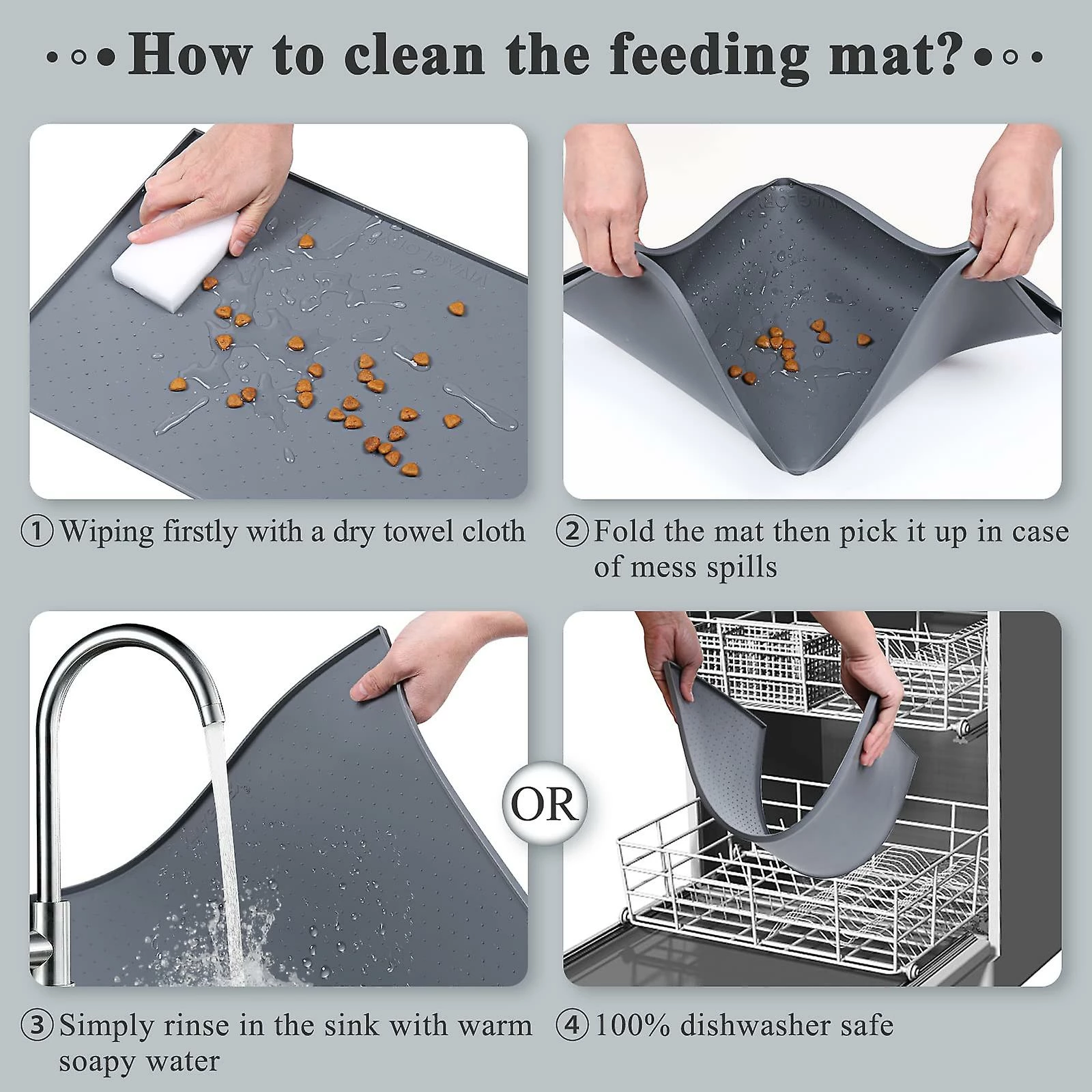 EASY TO USE AND CLEAN: This dog mat for food and water is very easy to clean, just rinse in the sink with warm soapy water, wipe with a cloth, wash by hand under the sink or in the dishwasher. If a lot of water is spilled on the mat, please wipe it with a dry terry cloth first. So water won’t spill on the floor while cleaning