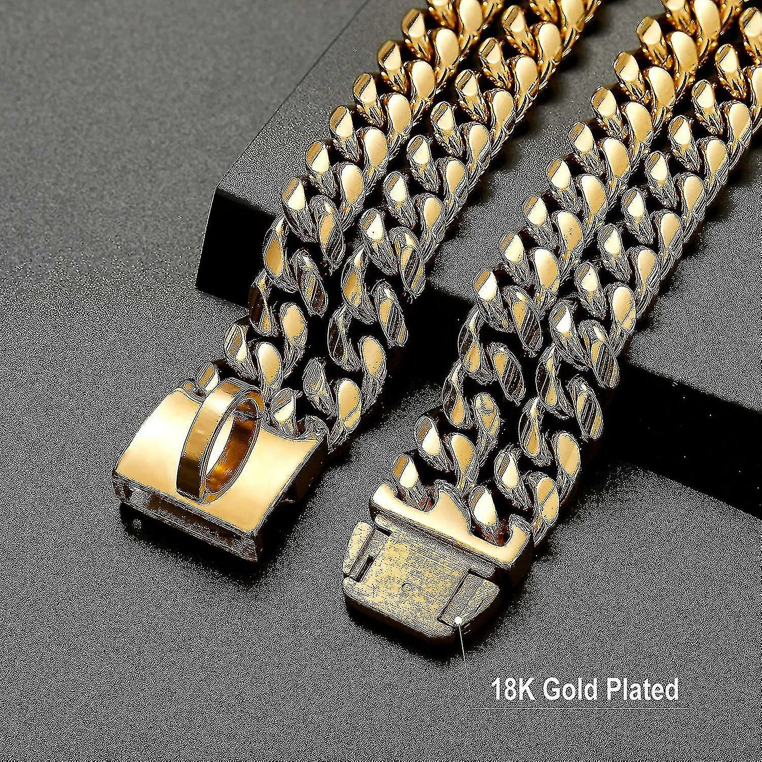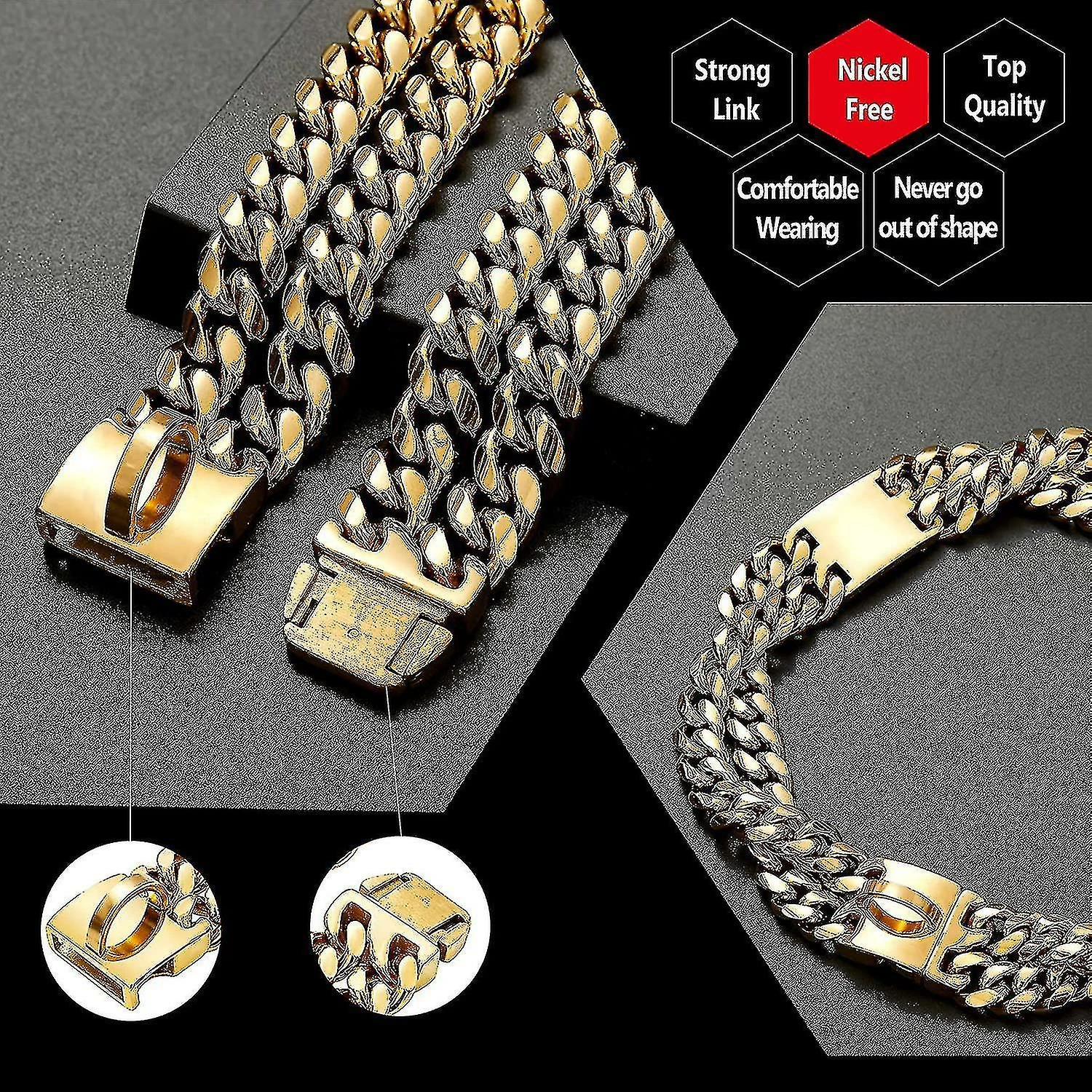 Heavy Double Chain Size:Chain Wide:24mm(0.95inch),Length:18inch.The widest point around your dogs Neck ,and add 1 inches for initial collar length for Adjustment.Strong Stainless Steel Buckle:Unique Stainless Steel Buckle with diamonds: This buckle is made of 316L stainless steel, which is very strong. The surface of the buckle is inlaid with many CZ diamonds. When your dog baby wears this dog collar with diamonds, it will be issued when walking in the sun The shining light is very beautiful. When you press the two buttons at the same time, it will quickly release your dog, very fast and convenient.High-Quality Material:Made of 304 stainless steel chain collar, Hand Polished,18K Gold Plated.Gold Dog Chain Chew Proof, Durable, No Rust, for years of use It is very strong that cant be pull it apart even with 680 lbs of forceFASHIONSTYLISH :18K Gold Dog Collar,Beautiful color, Its bling bling .Funny and amazing pet neck accesorries for your adorable dogs. Itll help you gain tons of compliments from your friends,your neighbors or other passerby.GUARANTEE:If you have any quality problems within 90 Days,you can contact us at any time for after-sales service. For whatever reason, if you dont absolutely love our gold dog collar, just return it, well refund .(Or replace it, if there is a problem).