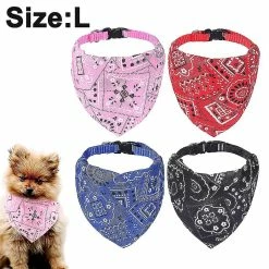 Size: S code is 1.5cm wide, 40cm long, and the length of the collar can be stretched 24-40cmM size is 2cm wide, 45cm long, and the length of the collar can be stretched 29-45cmL size is 2.5cm wide, 53cm long, and the length of the collar can be stretched 33-53cmColor: red+blue+black+pinkMaterial: PolyesterPackage content: 4*pet triangle scarf1. High quality materials: dog bandanas are made of soft polyester fabric, breathable and comfortable to wear, so your dog will not scratch and lose hair.2.Adjustable Collar:The pet collars are adjustable and suitable for most cats and dogs. You can choose the right size after measuring your pet’s neck circumference.3. FASHION STYLE: This pet bandana with fashion boho floral pattern, which makes your pet look adorable and attractive.4. Easy to use: the snap off buckle can be released quickly under pressure, is very safe for pets and convenient to open.5. Widely used: Perfect for daily use, parties, photo shoots or any other occasions where your pet looks more beautiful with these bibs.