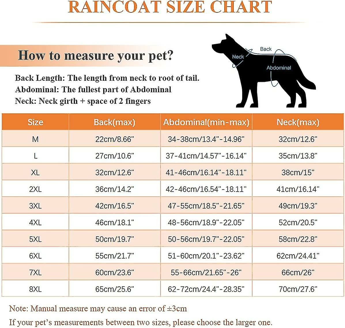 Size GuideAs the different body sizes of various dogs, please measure your pet’s body size before purchasing, and select the product according to the size. Please add up to two inches for chest measurements when choosing their size to prevent the raincoat from being too tight.