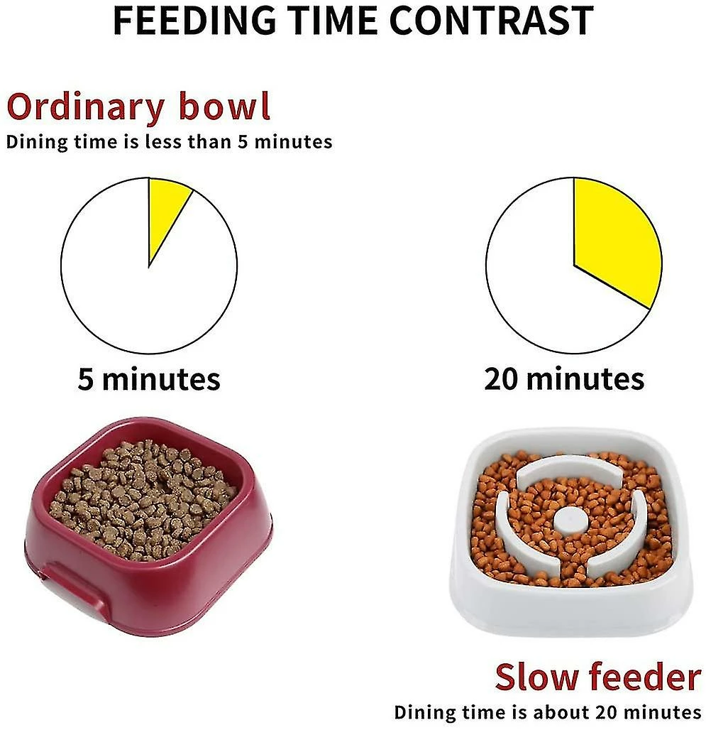 SIZE & DESIGN: The pet slow feeder cat bowl diameter: 7 1/2 Inch. Bottom diameter: 8 Inch. High: 1 3/5 Inch. It can hold 1 1/2 cups of food. Suitable for small/medium dogs.