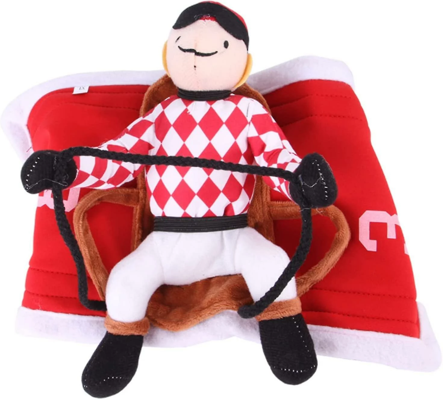 The funny jockey comes complete with saddle and stirrups and is the perfect outfit, red and white plaid jockey suit, red hat, white pants and black boots. Very realistic jockey. Your dog wears this dress like a jockey at the racetrack. It’s fun and cute.