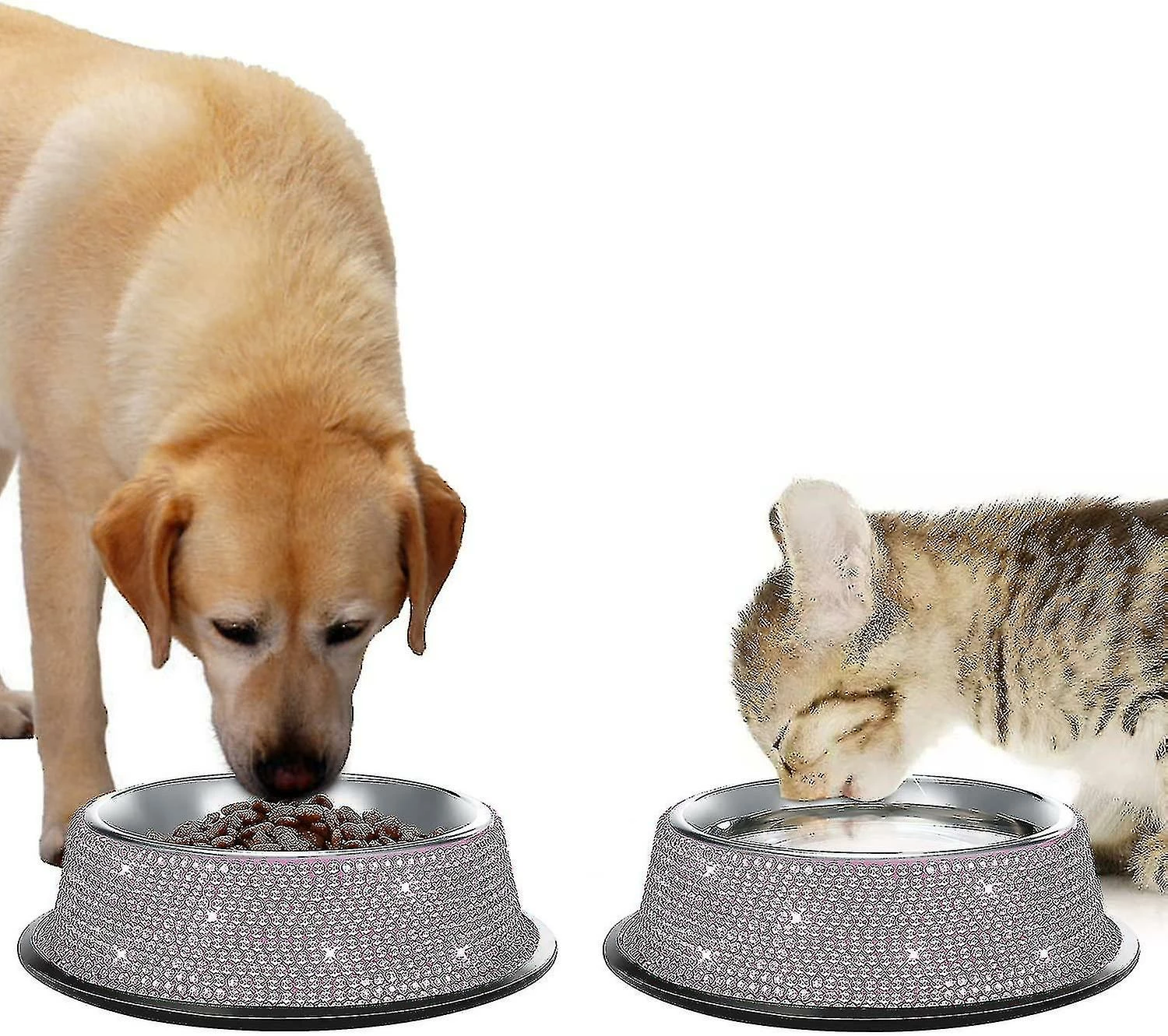 The pet bowl has a capacity of 320 ml and can hold up to approximately 4.5 ounces.Suitable for water, wet food or snacksMade of highquality stainless steel, safe and healthy, can be used for your dog or cat; durable, easytoclean surfaceThere is a rubber ring at the bottom of the pet water tank to prevent the bowl from slipping when the pet is eatingThe appearance of the pet bowl is covered with highquality rhinestones, which is more beautiful, shiny and higherend; it is the best choice for your pet feed bowl