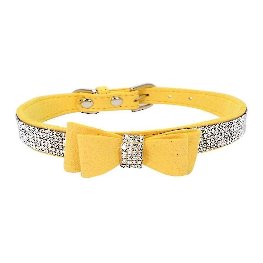 product content [XXS:(neck 6-8) Yellow].Soft velvet dog puppy pet collar decorated with beautiful rhinestone and exquisite bowknot diamond charm,easy to wear and remove.Its a new craft for rhinestone studded and this will keep the diamonds more flexible,good touch velvet and elegant metal buckle.looks flashing pretty and colorful.With this collar any cats or dogs will look like a princess.perfect for party costume, wedding holiday gifts.You can choose the fit size for your lovey pet.XXS:Overall length 0.6*10(1.5*25cm),will fit 6-8(15-21cm)neck./ XS:Overall length 0.6*12(1.5*30cm),will fit 8-10.6(21-27cm)neck./ S:Overall length 0.6*14.5(1.5*37cm),will fit 10.6-13(27-33cm)neck./ M:Overall length 0.8*16.5(2.0*42cm),will fit 13-15(33-39cm)neck./ L:Overall length 1.0*20(2.5*51cm),will fit 15-18(38-46cm)neck./ XL:Overall length 1.2*22(3.0*56cm),will fit 16-20(41-51cm)neck./ XXL:Overall length 1.2*24(3.0*61cm),will fit 18-22(46-56cm)neck./.Its really very important for size measurement.Many customers placed orders by wrong size and fall into an inconvenient return and replacement.To save your time and money,please choose a correct size option before you order,if you have any questions please contact us at any time .
