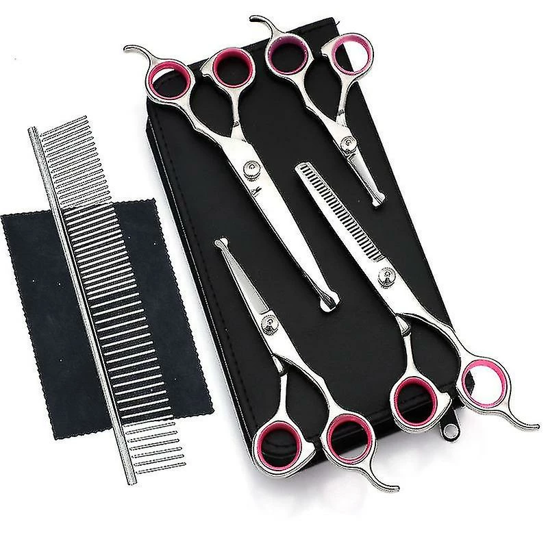 Constructionnomiquement conçu pour tenir confortablementNous savons également à quel point le toilettage peut être fastidieux, nous avons donc fabriqué les poignées ergonomiquement conçues pour tenir confortablement dans vos mains et vos mains ne se fatiguent pas et ne se blessent pas lors de l’utilisation des ciseaux<br><>6 en 1 Ensemble de ciseaux de toilettage pour chiensL’ensemble de ciseaux de toilettage pour chiens livré avec 2 ciseaux droits, 1 ciseau d’amincissement, 1 ciseau incurvé, 1 peigne de toilettage et 1 étui de rangement